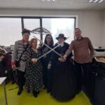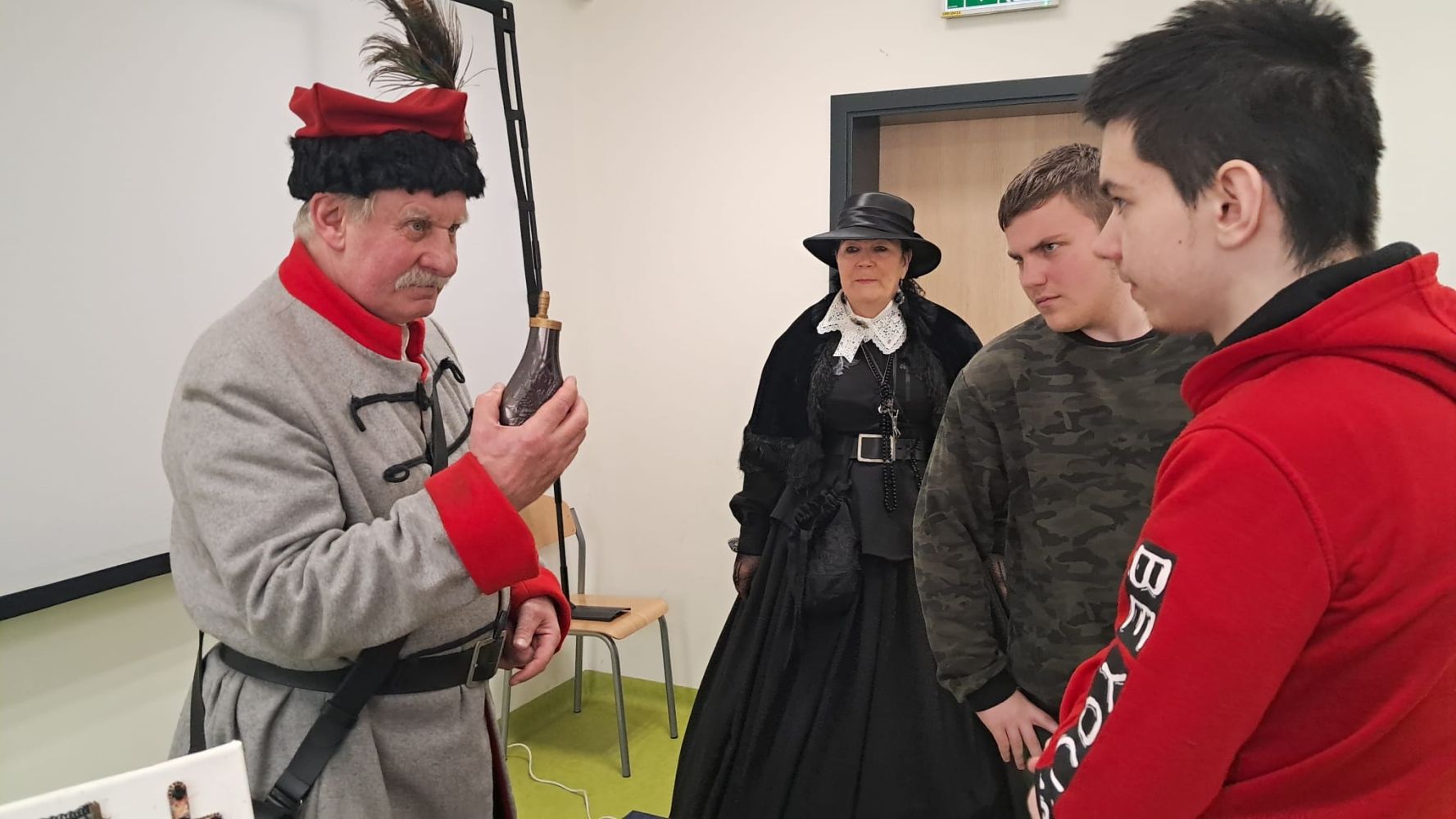 Troje prelegentów wystąpiło w historycznych strojach z epoki. Pan Eugeniusz Tomaszek i pan Jerzy Przybył ubrani byli w czamary i rogatywki, natomiast pani Anna Świegot zaprezentowała czarną suknię na krynolinie, charakterystyczną dla okresu Żałoby Narodowej, uzupełnioną pasem krakowskim oraz charakterystyczną biżuterią. Omawiając wyposażenie powstańców, prelegenci zaprezentowali m.in. szable, rewolwery i karabiny, które uczniowie z dużą uwagą oglądali. W trakcie prelekcji wspomniano również o innych rodzajach uzbrojenia stosowanych przez powstańców, takich jak kosy czy włócznie myśliwskie. Opowieść historyczna została osnuta wokół Bitwy pod Lututowem z 15 czerwca 1863 roku, w której przeważające siły wojsk rosyjskich rozbiły około 250-osobowy oddział dowodzony przez płk. Antoniego Korotyńskiego.