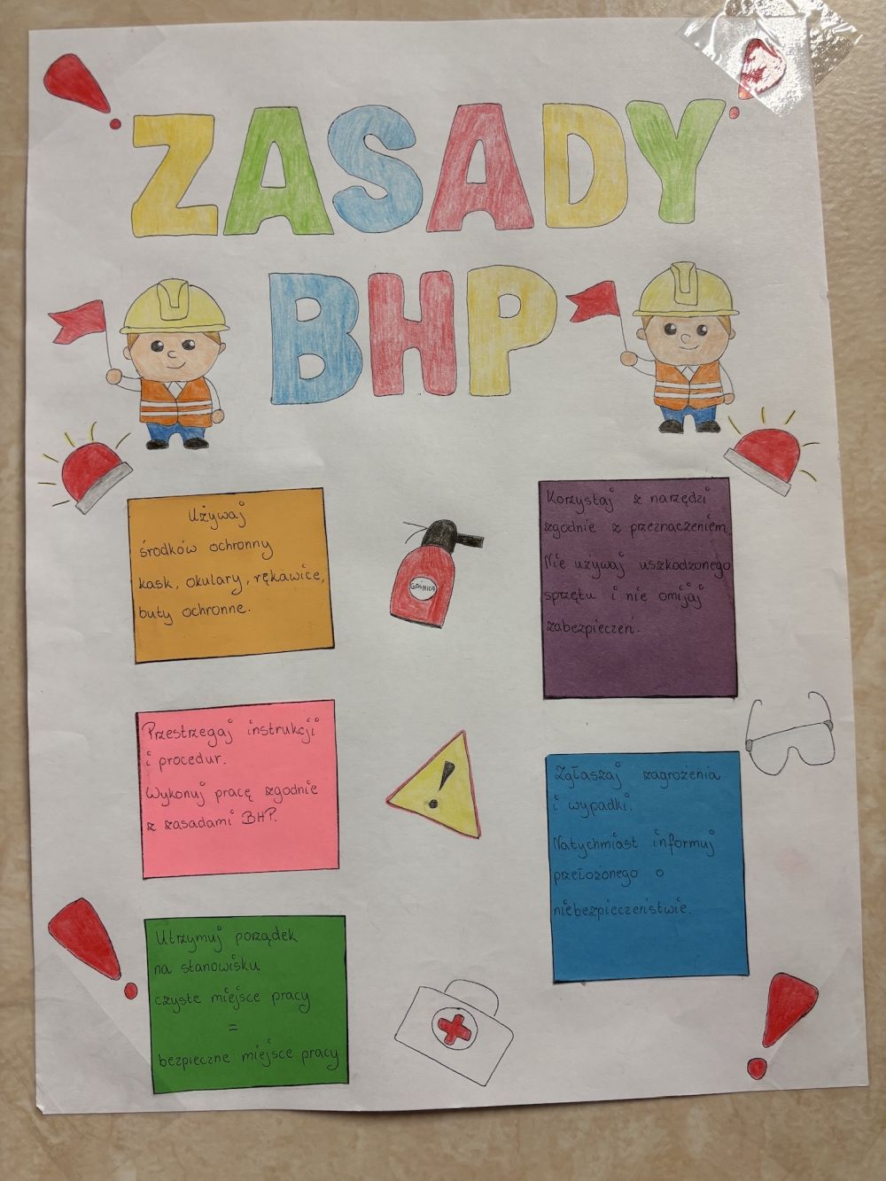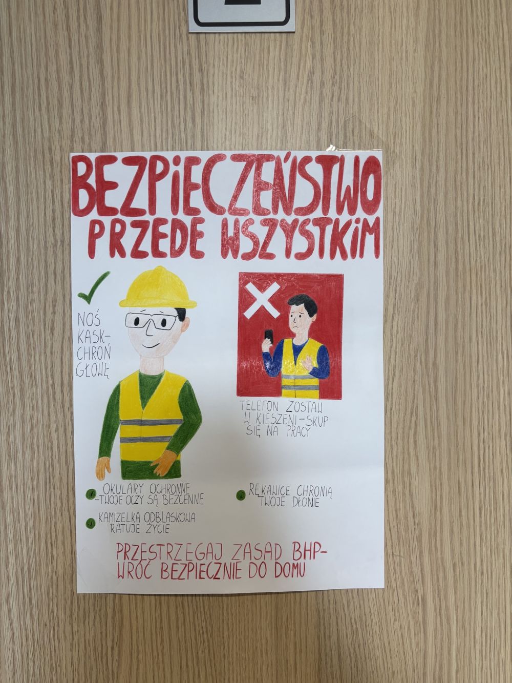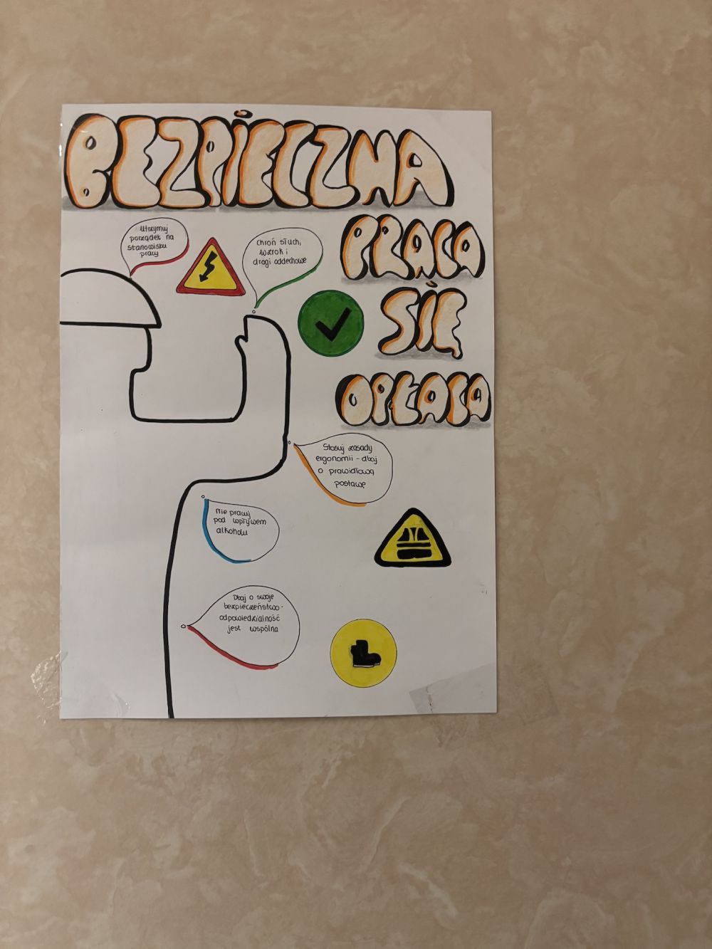 W ramach Tygodnia BHP młodzież naszej szkoły przygotowała prace plastyczne związane z tematyką bezpieczeństwa i higieny pracy. Odbyło się także spotkanie z Panią Karoliną Krawczyk-Borowiec – Inspektorem Powiatowej Stacji Sanitarno-Epidemiologicznej. W wydarzeniu uczestniczyli uczniowie klas 4Te1 i 4Te2.