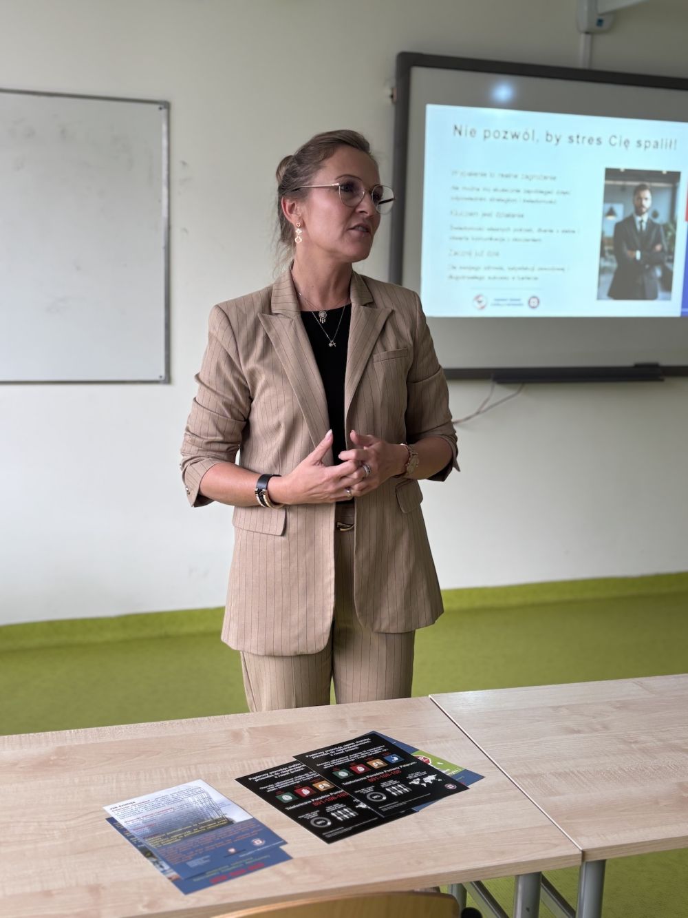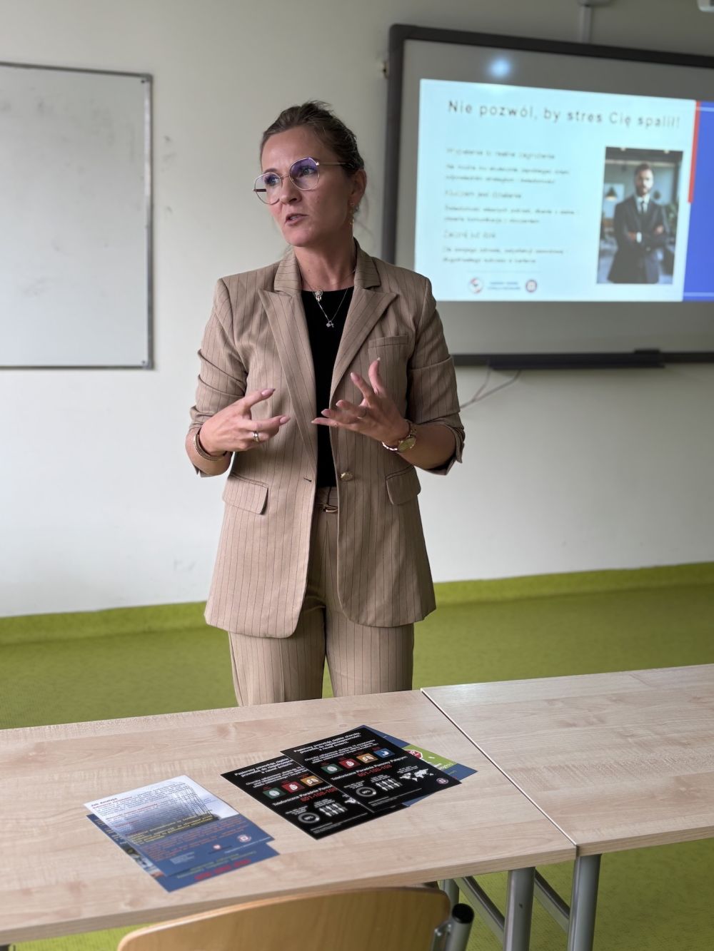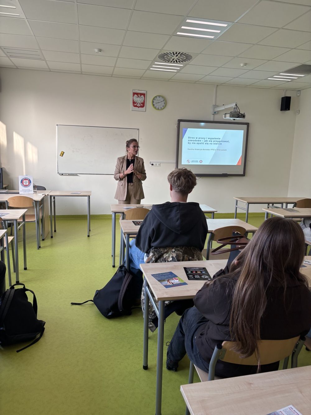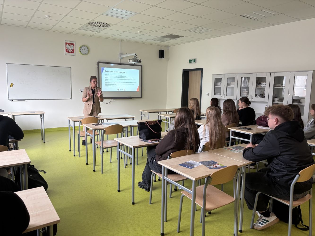 Spotkanie okazało się niezwykle inspirującą lekcją, pokazującą, jak wiele w pracy zawodowej zależy od nas samych. Uczniowie klas czwartych, którzy za dwa lata wejdą na rynek pracy, już dziś wiedzą, jak mogą przygotować się na stresujące sytuacje, których nie da się uniknąć – ale z którymi można skutecznie sobie radzić. Pani Karolina, dzieląc się swoim bogatym doświadczeniem, przytoczyła liczne przykłady z zakładów pracy, pokazując realne konsekwencje nieopanowanego stresu.