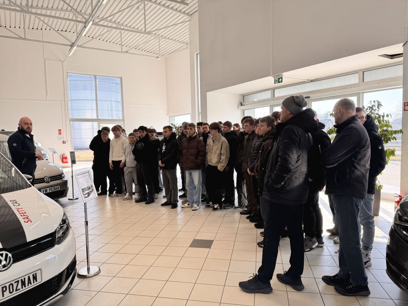 Pierwszym punktem programu była wizyta w fabryce Volkswagen Poznań. Uczniowie mieli niepowtarzalną okazję zobaczyć na żywo złożony i precyzyjnie zaplanowany proces produkcji samochodów osobowych i dostawczych. Zwiedzanie obejmowało kolejne etapy powstawania pojazdów – od budowy i zgrzewania karoserii, poprzez lakiernię i montaż końcowy, aż po logistykę i kontrolę jakości gotowych pojazdów.